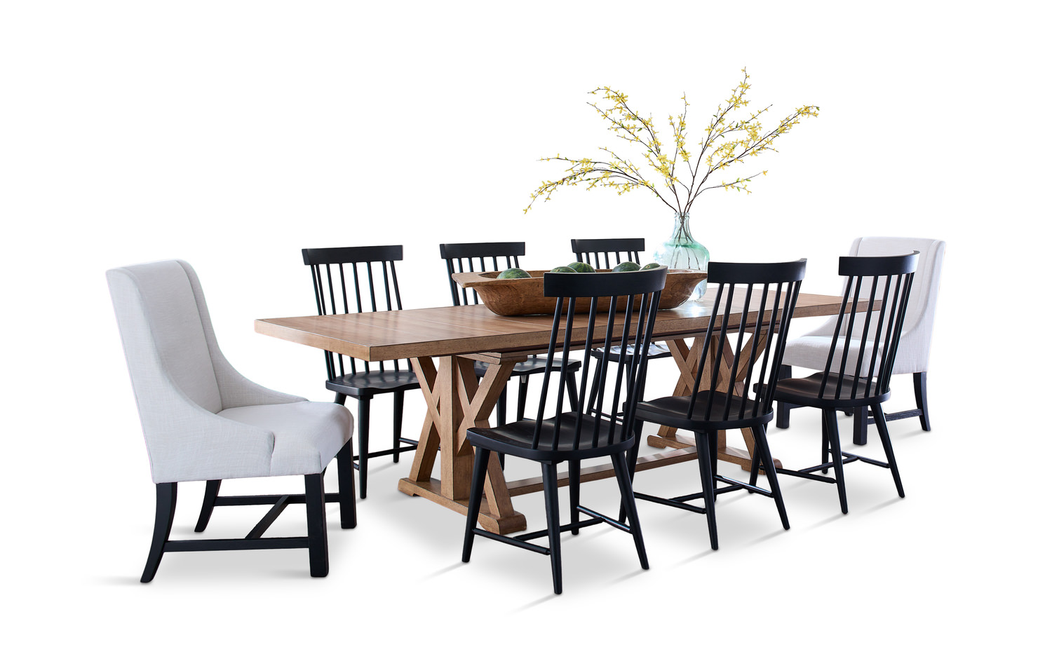 Introducing the exquisite Clear Lake Trestle Set by Hennen's Furniture, a true embodiment of luxury and style. Crafted with Hickory veneers and hardwood solids, this table boasts a unique blend of durability and sophistication. The table is 42" X 82" and extends to 102" with 1-20" take-out leaf that offers versatility and convenience, allowing you to effortlessly adjust the table size to accommodate your guests. With a touch of slight distressing, this Transitional Style dining table seamlessly combines elements of Farmhouse charm with a modern twist. The sleek Rectangle Shape and sturdy Trestle design ensure both elegance and stability, making it a statement piece in any dining room. The Windsor style chair has a soft black finish that's also part of the upholstered host chairs. Set includes 4 Windsor chairs and 2 host chairs. Additional chairs available to achieve the look in the photo.