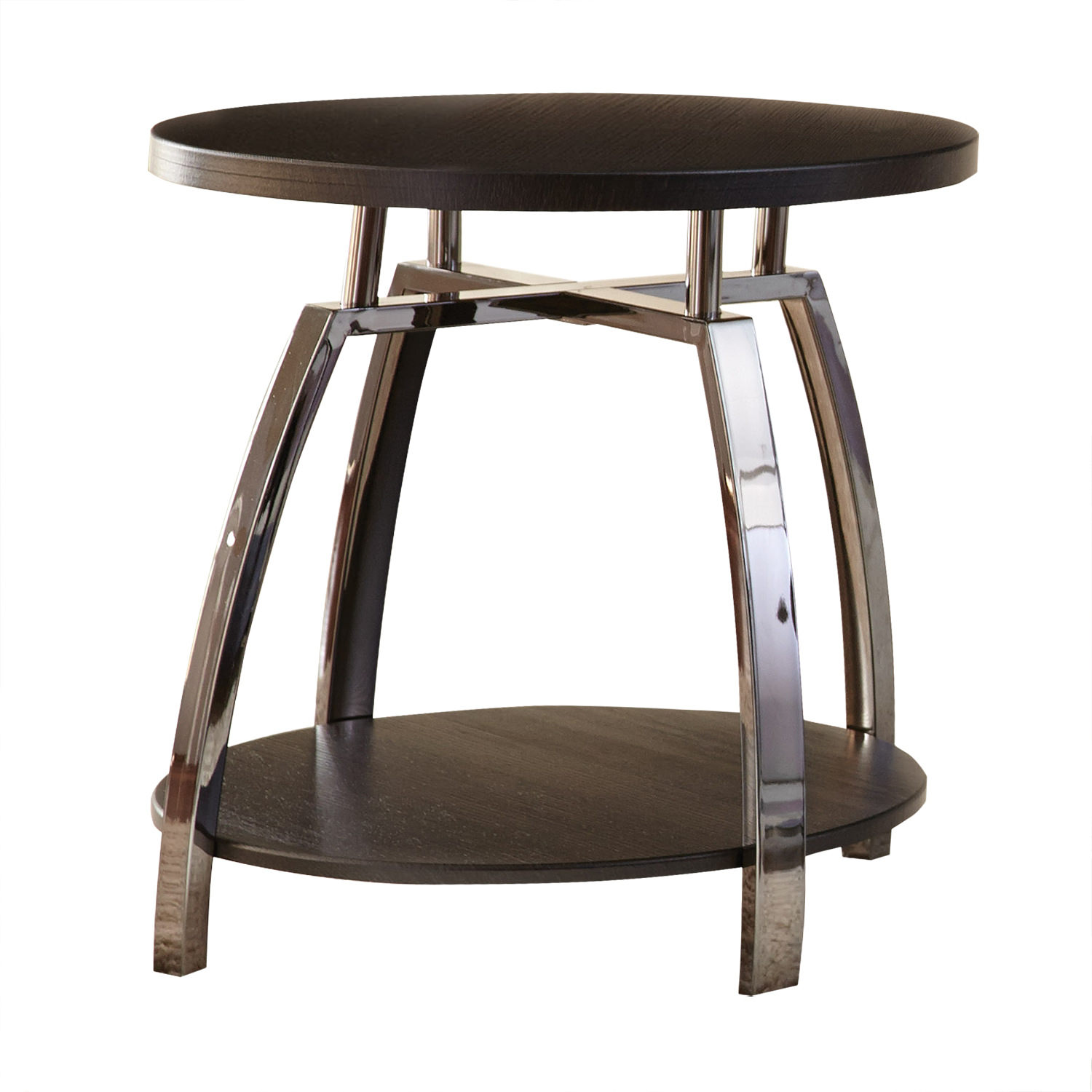 Add a touch of modern elegance to your living space with the Peddy End Table from Hennen's Furniture. This sleek table features a rich brown color that complements any decor, while the chrome finish adds a contemporary flair. The stationary shelf provides ample storage space, and the casters ensure easy mobility for your convenience. With a striking black nickel finish on the base and a durable Silvershield PVC laminate top, this table is as stylish as it is practical. Elevate your home with the Peddy End Table and enjoy both form and function in one beautiful piece.
