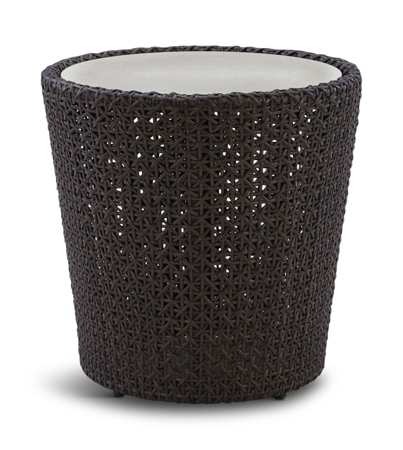 Introducing the Lenox Hill Round End Table from Hennen's Furniture, the perfect blend of style and functionality for your indoor or outdoor space. This modern and sleek side table features a durable aluminum frame and a top crafted from Dekton material in a stunning shell finish. Or for the fossil top option for a unique touch. The weave detail on this end table adds a touch of elegance, with the brindle weave shown or the option to choose quarry grey for a different look. Minimal assembly is required, making it easy to set up and start enjoying. The deep brown color adds a contemporary flair that will complement any decor. Limted assemble required.
